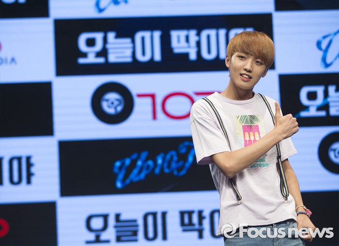 (서울=포커스뉴스) 4일 오후 서울 강남구 일지아트홀에서 열린 아이돌 그룹 업텐션의 미니앨범 'Summer go'발표 쇼케이스에 참석한 멤버 선율이 포토타임을 갖고 있다.