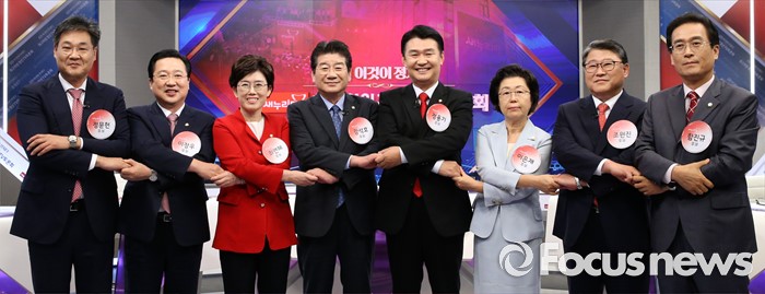 (서울=포커스뉴스) 4일 서울 중구 TV조선 스튜디오에서 열린 새누리당 최고위원 후보자 TV토론회에 참석한 의원들이 포즈를 취하고 있다. 왼쪽부터 정문헌 전 의원, 이장우, 최연혜, 강석호, 정용기, 이은재, 조원진, 함진규 의원.
