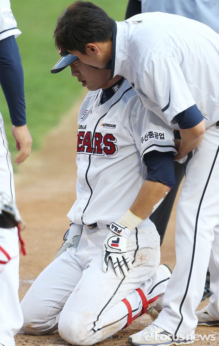 (서울=포커스뉴스) 4일 서울 잠실구장에서 열린 2016 프로야구 LG-두산 경기에서 1회말 두산 선두타자 박건우가 LG 투수 임찬규의 투구에 맞고 트레이너의 치료를 받고 있다.