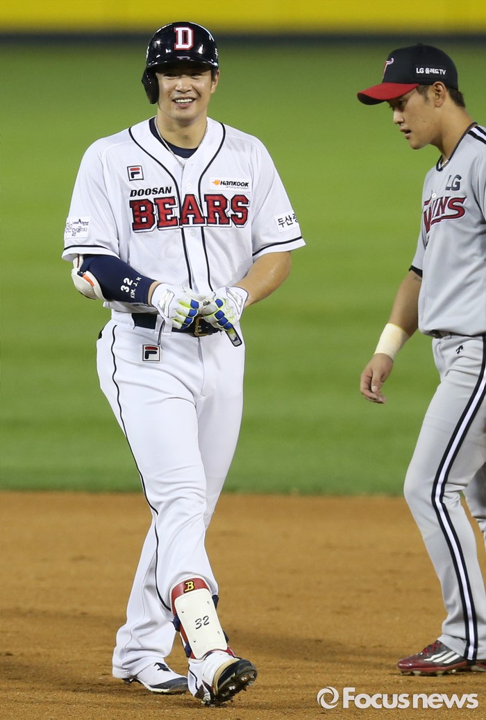 (서울=포커스뉴스) 4일 서울 잠실구장에서 열린 2016 프로야구 LG-두산 경기 6회말 두산 선두타자 김재환이 LG 3루수 히메네스의 수비 시프트로 빈 3루 방향으로 타구를 날려 2루타를 만들고 2루에서 활짝 웃고 있다.