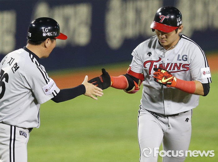 (서울=포커스뉴스) 4일 서울 잠실구장에서 열린 2016 프로야구 LG-두산 경기 연장 10회초 1사후 LG 오지환이 좌월 솔로 홈런을 치고 3루를 돌며 유지현 코치와 악수하고 있다.