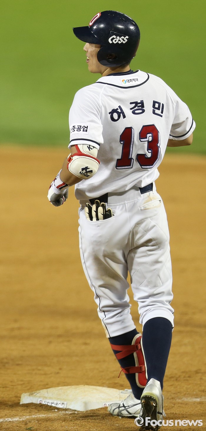 (서울=포커스뉴스) 4일 서울 잠실구장에서 열린 2016 프로야구 LG-두산 경기 연장 10회말 1사 1,2루에서 두산 허경민이 좌전 안타를 치고 1루에서 아쉬워하고 있다.