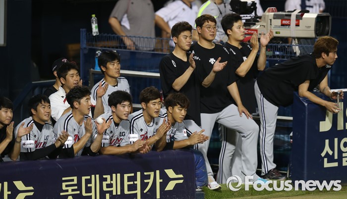 (서울=포커스뉴스) 4일 서울 잠실구장에서 열린 2016 프로야구 LG-두산 경기에서 두산을 연장 12회에 물리친 LG 선수들이 더그아웃에서 박수치며 격려하고 있다.
