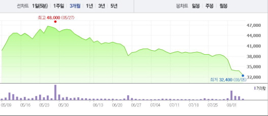 이는 일주일 전 주가인 7월28일(3만8500원)과 비교했을 때 15.58% 떨어진 수치다.