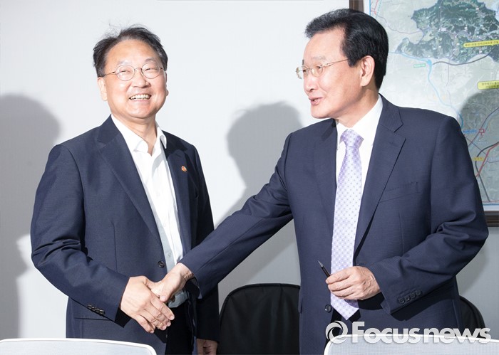(서울=포커스뉴스) 5일 오전 서울 여의도 국회 의원회관에서 추경 예산 등 협조를 위해 방문한 유일호(왼쪽) 경제부총리 겸 기획재정부 장관과 변재일 더불어민주당 정책위의장이 만나 인사하고 있다.