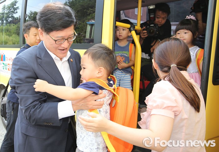 (세종=포커스뉴스) 정진엽 보건복지부 장관이 5일 오전 세종시 금남면 금남어린이집을 방문, 어린이통학차량으로 등원하는 어린이를 차량에서 내려주고 있다.