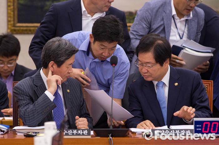 (서울=포커스뉴스) 김영석(오른쪽) 해양수산부 장관과 윤학배(왼쪽) 차관이 5일 오전 서울 여의도 국회에서 열린 국회 농림축산식품해양수산위원회 전체회의에 참석해 회의시작 전 해수부 관계자와 대화하고 있다.