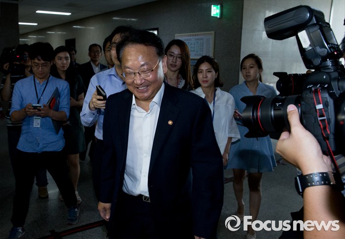 (서울=포커스뉴스) 5일 오전 서울 여의도 국회에서 추경 예산 등 협조를 위해 방문한 유일호 경제부총리 겸 기획재정부 장관이 여야 지도부를 만나기 위해 이동하고 있다.