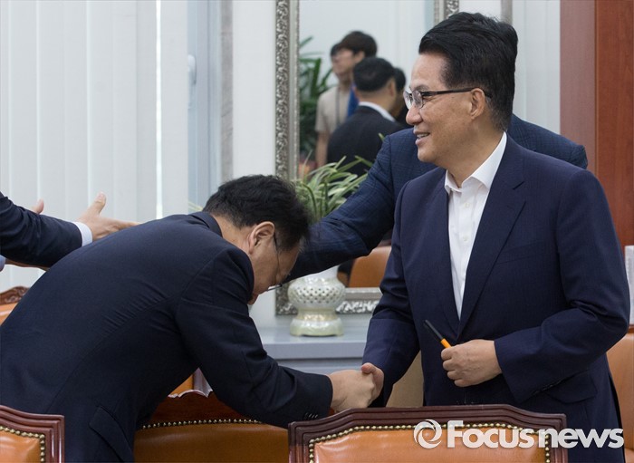 (서울=포커스뉴스) 5일 오전 서울 여의도 국회에서 추경 예산 등 협조를 위해 방문한 유일호(왼쪽) 경제부총리 겸 기획재정부 장관이 박지원 국민의당 비상대책위원장과 인사하고 있다.
