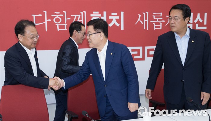 (서울=포커스뉴스) 5일 오전 서울 여의도 국회에서 추경 예산 등 협조를 위해 방문한 유일호 경제부총리 겸 기획재정부 장관이 새누리당 원내지도부와 인사하고 있다. 왼쪽부터 유 부총리, 김도읍 새누리당 원내수석부대표, 김광림 정책위의장, 정진석 원내대표.