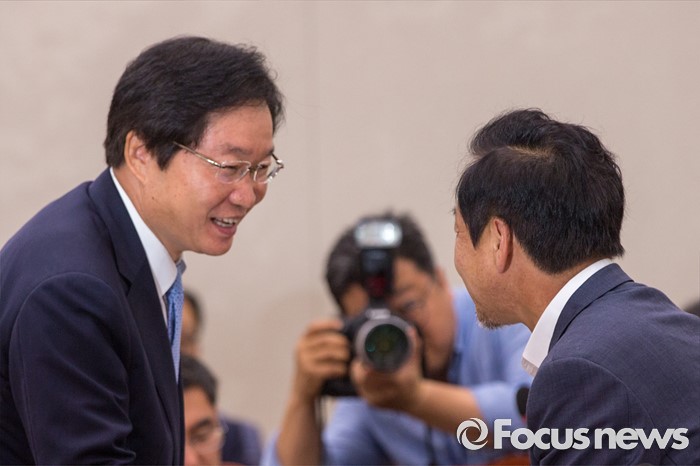 (서울=포커스뉴스) 이완영(오른쪽) 새누리당 의원과 김영석 해양수산부 장관이 5일 오전 서울 여의도 국회에서 열린 국회 농림축산식품해양수산위원회 전체회의에 참석해 대화하고 있다.