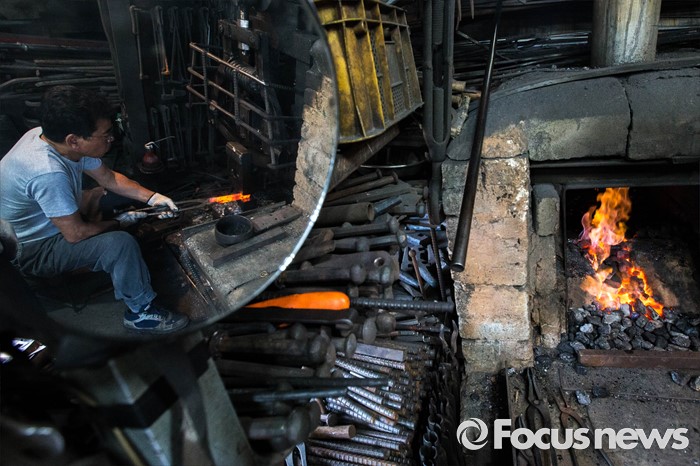 (서울=포커스뉴스) 서울이 낮 최고 36도를 기록하는 등 전국적으로 불볕더위가 기승을 부리는 5일 오전 서울 은평구 수색동에 위치한 형제대장간에서 류상준(63)씨가 화덕 앞에서 건설용 공구를 만드는 작업을 하고 있다.