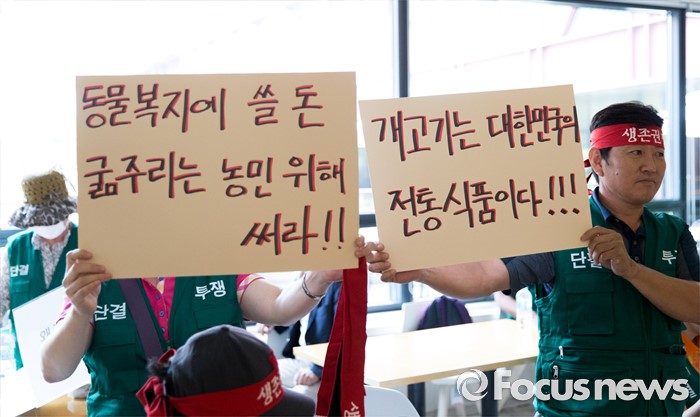 (서울=포커스뉴스) 5일 오전 서울 종로구 서울역사박물관에서 대한육견협회 회원들이 개 식용 종식을 위한 국제컨퍼런스를 반대하는 집회를 하고 있다.
