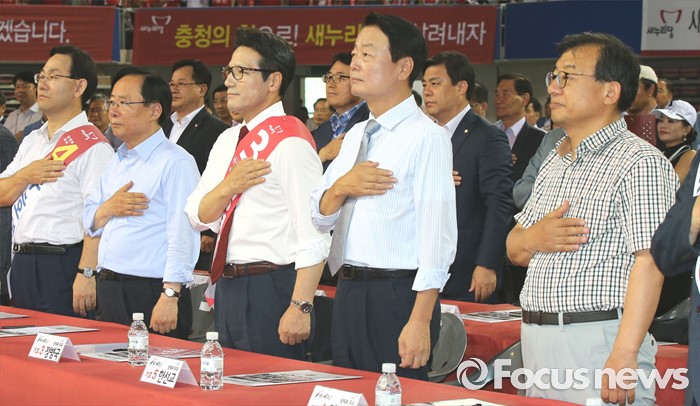 (천안=포커스뉴스) 5일 오후 충남 천안시 유관순체육관에서 열린 새누리당 대표 및 최고위원 선출 충청권 합동연설회에서 당대표 후보들이 국기에 대한 경례를 하고 있다. 왼쪽부터 주호영, 이주영, 정병국, 한선교, 이정현 후보.