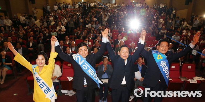 (서울=포커스뉴스) 더불어민주당 전당대회 당대표에 출마한 후보들이 5일 오후 서울 여의도 국회의원회관에서 열린 '전당대회 당대표 예비경선(컷오프)'에 참석해 정견발표에 앞서 손을 잡고 사진촬영을 하고 있다. 오른쪽부터 송영길 후보, 김상곤 후보, 이종걸 후보, 추미애 후보.