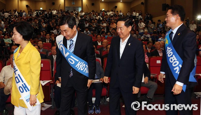 (서울=포커스뉴스) 더불어민주당 대표선출을 위한 예비경선대회가 열린 5일 오후 서울 여의도 국회 의원회관에서 후보들이 참석자들에게 인사한 뒤 자리로 돌아가고 있다. 왼쪽부터 추미애, 이종걸, 김상곤, 송영길 후보.