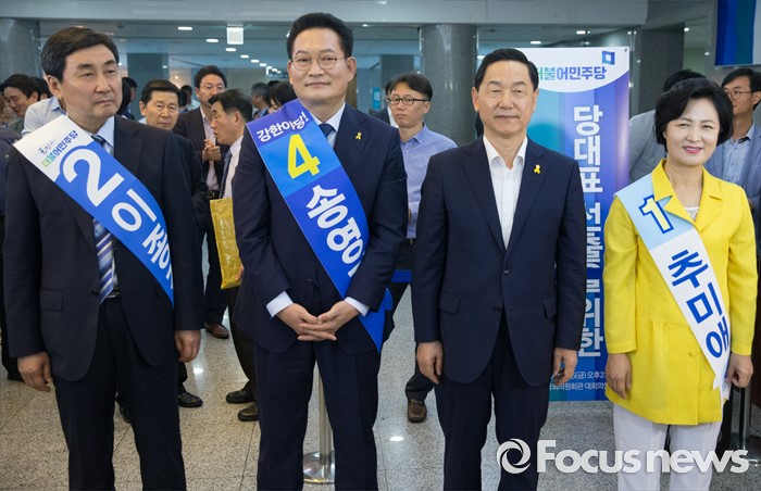 (서울=포커스뉴스) 5일 오후 서울 여의도 국회 의원회관에서 열린 더불어민주당 당대표 선출을 위한 예비경선대회에 참석한 이종걸(왼쪽부터), 송영길, 김상곤, 추미애 당대표 후보가 참석자들에게 지지를 호소하기 위해 기다리고 있다.
