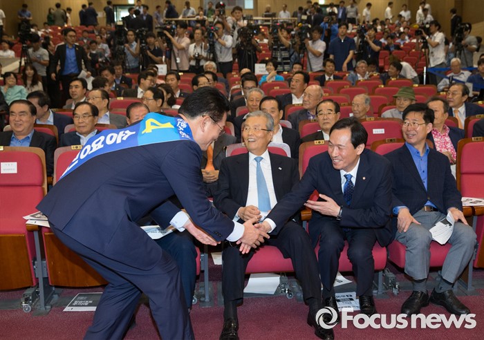 (서울=포커스뉴스) 5일 오후 서울 여의도 국회 의원회관에서 열린 더불어민주당 당대표 선출을 위한 예비경선대회에 참석한 우상호 원내대표와 송영길 당대표 후보가 인사하고 있다. 왼쪽부터 송 후보, 김종인 비대위 대표, 우 원내대표, 양승조 비대위원.