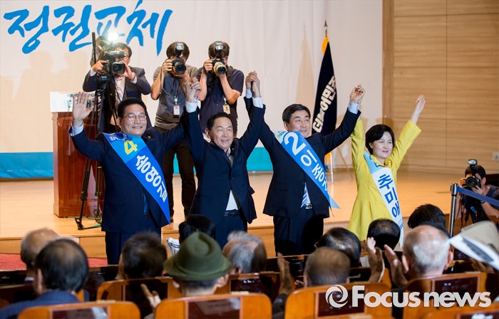 한편, 이날 총 363명의 선거인단 가운데 263명이 투표에 참여했고 투표율은 72.45%였다.5일 오후 서울 여의도 국회 의원회관에서 열린 더불어민주당 당대표 선출을 위한 예비경선대회에 참석한 송영길(왼쪽부터), 김상곤, 이종걸, 추미애 당대표 후보가 손을 들어 인사하고 있다. 2016.08.05 박동욱 기자
