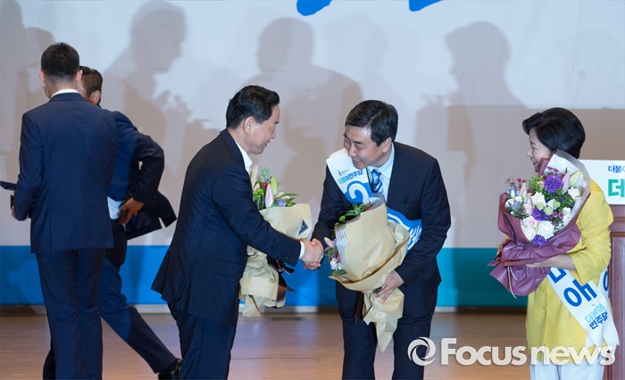 (서울=포커스뉴스) 5일 오후 서울 여의도 국회 의원회관에서 더불어민주당 당대표 선출을 위한 예비경선대회를 마친 김상곤(왼쪽부터), 이종걸, 추미애 당대표 후보가 인사하고 있다.