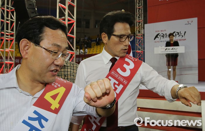(천안=포커스뉴스) 5일 오후 충남 천안시 유관순체육관에서 열린 새누리당 대표 및 최고위원 선출 충청권 합동연설회에서 당 대표에 출마한 주호영(왼쪽) 후보와 정병국 후보가 합동연설회를 마치고 대화를 나누고 있다.