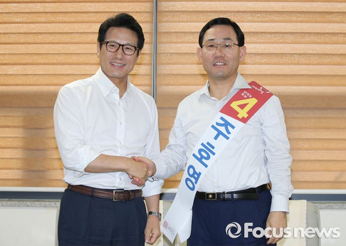 (천안=포커스뉴스) 새누리당 전당대회를 4일 앞두고 5일 오후 충남 천안 유관순체육관에서 충청권 합동연설회를 마치고 비박계 당권주자들의 2차 단일화에서 주호영(오른쪽) 후보가 단일 후보로 결정 됐다. 정병국 후보와 주호영 후보가 악수를 하고 있다.