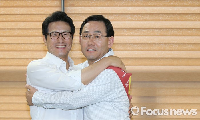 (천안=포커스뉴스) 새누리당 전당대회를 4일 앞두고 5일 오후 충남 천안 유관순체육관에서 충청권 합동연설회를 마치고 비박계 당권주자들의 2차 단일화에서 주호영(오른쪽) 후보가 단일 후보로 결정 됐다. 정병국 후보와 주호영 후보가 포옹을 하고 있다.