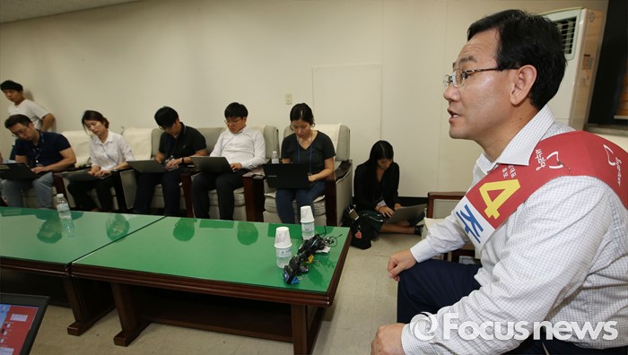 (천안=포커스뉴스) 새누리당 전당대회를 4일 앞두고 5일 오후 충남 천안 유관순체육관에서 충청권 합동연설회를 마치고 비박계 당권주자들의 2차 단일화에서 주호영 후보가 단일 후보로 결정 됐다. 주호영 후보가 질문에 답변하고 있다.
