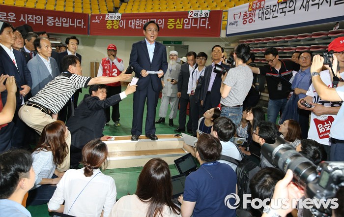 (천안=포커스뉴스) 5일 오후 충남 천안시 유관순체육관에서 열린 새누리당 대표 및 최고위원 선출 충청권 합동연설회에서 당 대표에 출마한 이주영 후보가 합동연설회를 마치고 기자회견을 하고 있다.