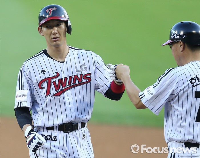 (서울=포커스뉴스) 5일 서울 잠실구장에서 열린 2016 프로야구 kt-LG 경기 1회말 무사 2루에서 LG 손주인이 중전 적시타를 치고 1루에서 한혁수 코치와 주먹을 마주치고 있다.
