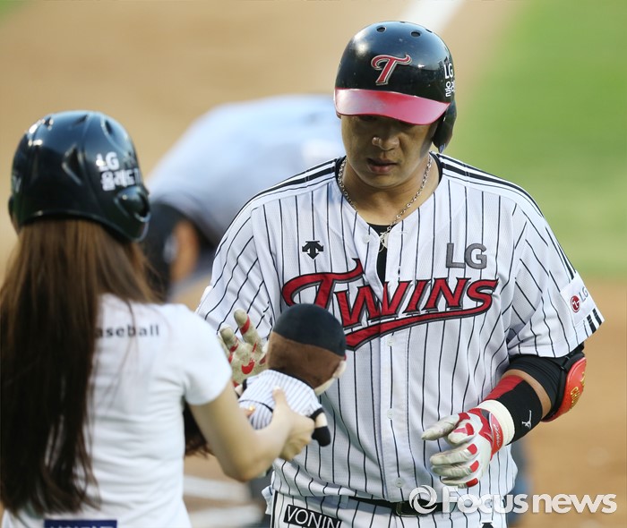 (서울=포커스뉴스) 5일 서울 잠실구장에서 열린 2016 프로야구 kt-LG 경기 2회말 LG 선두타자로 나온 정상호가 좌월 솔로 홈런을 치고 홈인하며 인형을 받고 있다.