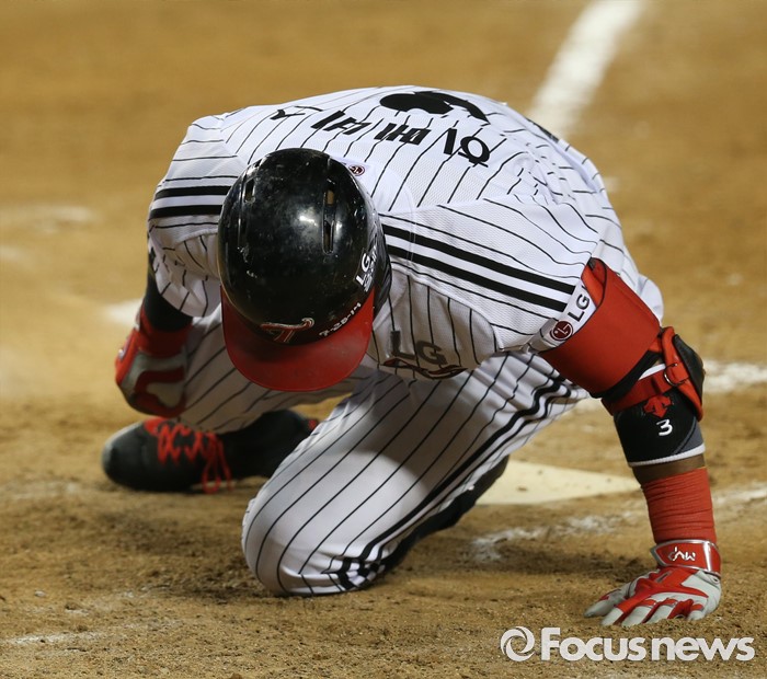 (서울=포커스뉴스) 5일 서울 잠실구장에서 열린 2016 프로야구 kt-LG 경기 5회말 2사 1루에서 LG 히메네스가 자신의 파울 타구에 오른쪽 무릎을 맞고 고통스러워하고 있다.