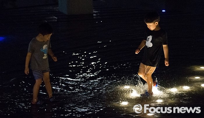 (서울=포커스뉴스) 폭염과 열대야가 지속되고 있는 5일 오후 서울 여의도 한강공원 내 물빛광장을 찾은 시민들이 물놀이를 하며 더위를 식히고 있다.