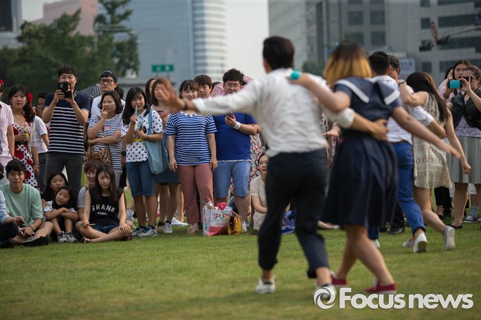 (서울=포커스뉴스) 6일 오후 서울 중구 시청 앞 광장에서 열린 '서울 스윙댄스 페스티벌'에서 청년문화예술단체 딴따라땐스홀 회원들이 음악에 맞춰 스윙댄스를 추고 있다.