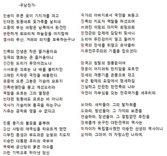 '우남찬가'는 가로로 읽으면 이 전 대통령을 찬양하는 내용으로 가득 차 있지만 각 행 앞글자만 골라서 세로로 읽으면 '한반도분열', '국민버린도망자', '친일인사고용민족반역자' 등으로 읽을 수 있다.