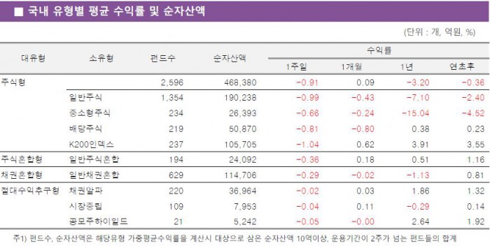 일반주식펀드와 배당주식펀드도 각각 0.99%, 0.81% 하락했다. 중소형주식펀드는 -0.66%의 수익률로 상대적으로 양호했다.