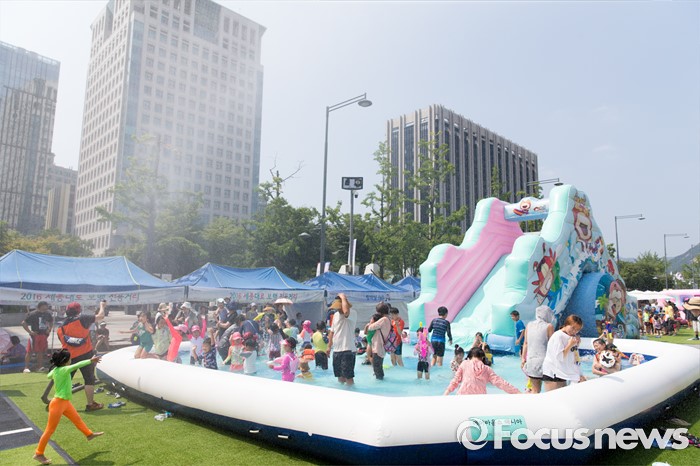 (서울=포커스뉴스) 절기상 입추인 7일 오후 서울 종로구 광화문 세종대로에 설치된 물놀이장에서 어린이들이 즐거운 시간을 보내고 있다.