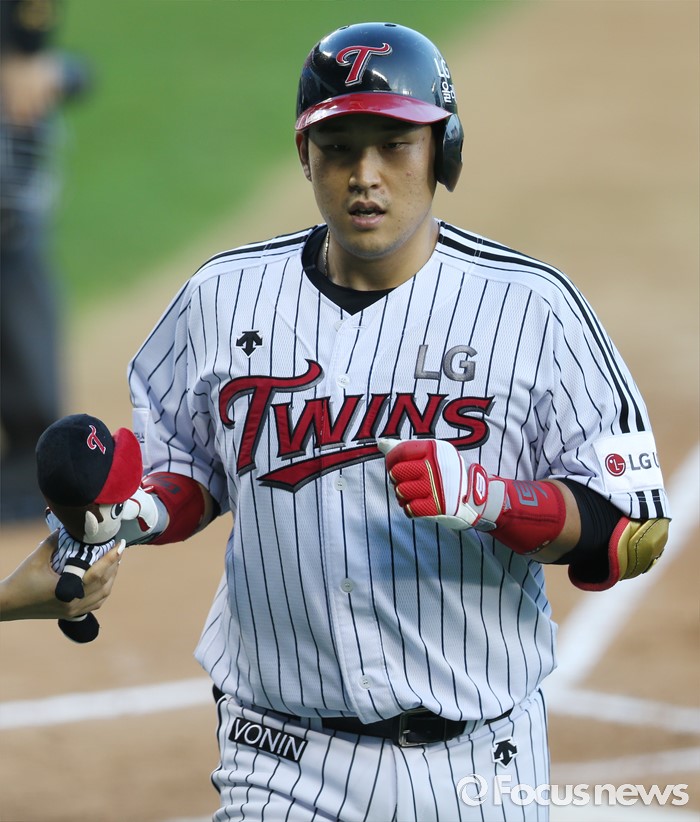 (서울=포커스뉴스) 5일 서울 잠실구장에서 열린 2016 프로야구 kt-LG 경기 3회말 LG 선두타자 유강남이 좌월 솔로 홈런을 치고 홈인하며 인형을 받고 있다.