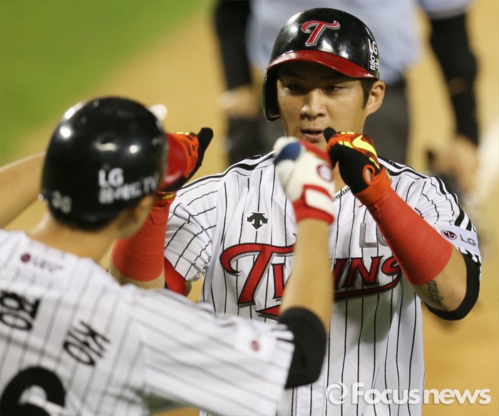 (서울=포커스뉴스) 5일 서울 잠실구장에서 열린 2016 프로야구 kt-LG 경기 7회말 2사후 LG 오지환이 우월 솔로 홈런을 치고 홈인하며 이형종의 환영을 받고 있다.