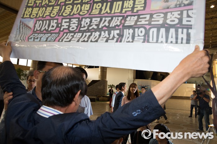 (서울=포커스뉴스) 더불어민주당 사드대책위 간사인 김영호 의원이 사드 배치와 관련한 중국 방문 일정을 위해 8일 오전 서울 강서구 김포공항에서 출국 전 취재진의 질문이 끝난 뒤 이동하는 가운데 한 시민단체 회원의 피켓 항의를 받고 있다. 김 의원을 비롯해 김병욱·박정·소병훈·손혜원·신동근 의원 등 초선의원 6명은 8일부터 2박 3일간 중국에 머문 뒤 10일 귀국한다.