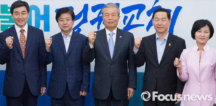| △ 파이팅 외치는 더민주 당대표 후보들과 김종인 대표 |