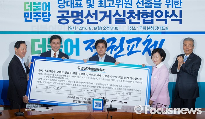 (서울=포커스뉴스) 8일 오전 서울 여의도 국회에서 열린 더불어민주당 당대표 및 부문별 최고위원 선출을 위한 공명선거 협약식에 참석한 당대표 후보들이 노웅래 선거관리위원장에게 협약서 서명 후 전달하고 있다. 왼쪽부터 김상곤, 이종걸 당대표 후보, 노 위원장, 추미애 당대표 후보, 김종인 비대위 대표.