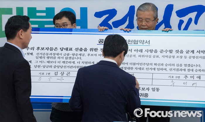 (서울=포커스뉴스) 8일 오전 서울 여의도 국회에서 열린 더불어민주당 당대표 및 부문별 최고위원 선출을 위한 공명선거 협약식에 참석한 김종인(오른쪽) 비대위 대표가 당대표 후보들의 서명하는 모습을 바라보고 있다.