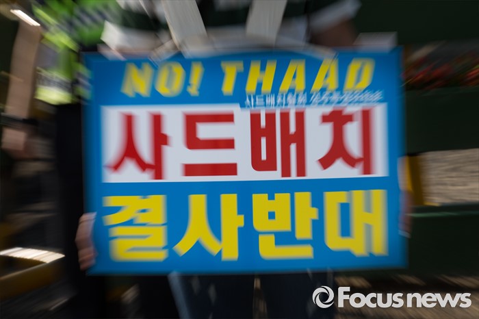 (서울=포커스뉴스) 8일 오전 서울 용산구 국방부 앞에서 사드배치철회 성주투쟁위원회 소속 성주군민이 사드 성주배치 철회를 촉구하는 피켓을 몸에 걸고 서 있다.