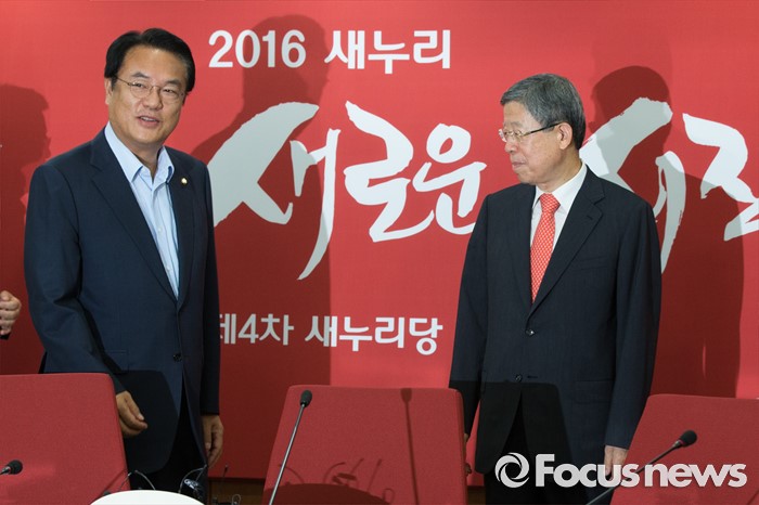 (서울=포커스뉴스) 김희옥(오른쪽) 새누리당 혁신비상대책위원장과 정진석 원내대표가 8일 오전 서울 여의도 새누리당사에서 열린 마지막 혁신비상대책위원회의에 참석하기 위해 회의실로 들어서고 있다.
