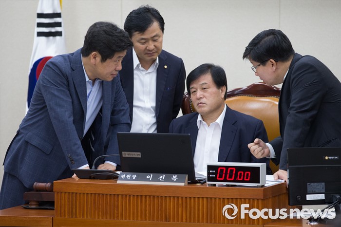 (서울=포커스뉴스) 8일 오전 서울 여의도 국회에서 열린 정무위원회 전체회의에 참석한 이진복 위원장과 3당 간사가 대화하고 있다. 왼쪽부터 유의동 새누리당 간사, 김관영 국민의당 간사, 이 위원장, 전해철 더불어민주당 간사.