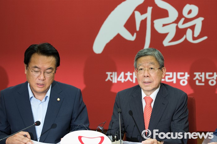 (서울=포커스뉴스) 김희옥(오른쪽) 새누리당 혁신비상대책위원장이 8일 오전 서울 여의도 새누리당사에서 열린 마지막 혁신비상대책위원회의에 참석해 모두발언을 하고 있다.