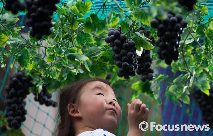 (서울=포커스뉴스) 8일 오전 서울 광화문광장에서 열린 '2016 포도데이' 행사에 참석한 한 어린아이가 포도를 따고 있다.