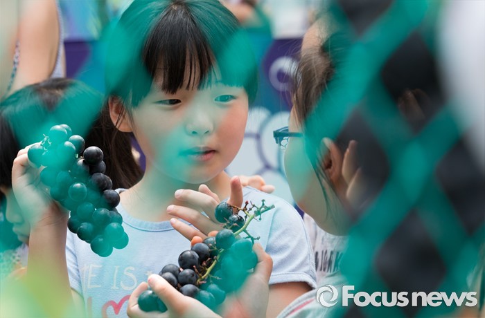 (서울=포커스뉴스) 8일 오전 서울 광화문광장에서 열린 '2016 포도데이' 행사에 참석한 아이들이 포도를 들고 대화를 나누고 있다.