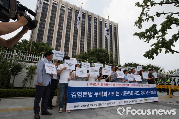 (서울=포커스뉴스) 8일 오전 서울 종로구 정부서울청사 정문 앞에서 경제정의실천시민연합(경실련) 회원들이 김영란법 무력화시키는 기준완화 시도 중단 촉구 기자회견을 하고 있다.